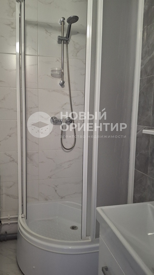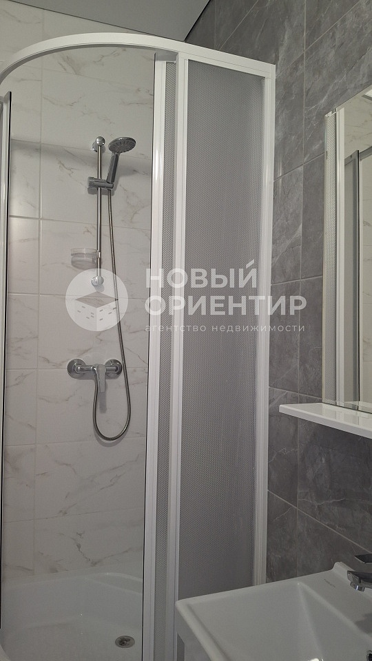 Полностью готовый санузел: кафель до потолка, душевая кабина, унитаз, раковина, зеркало, шкафчик