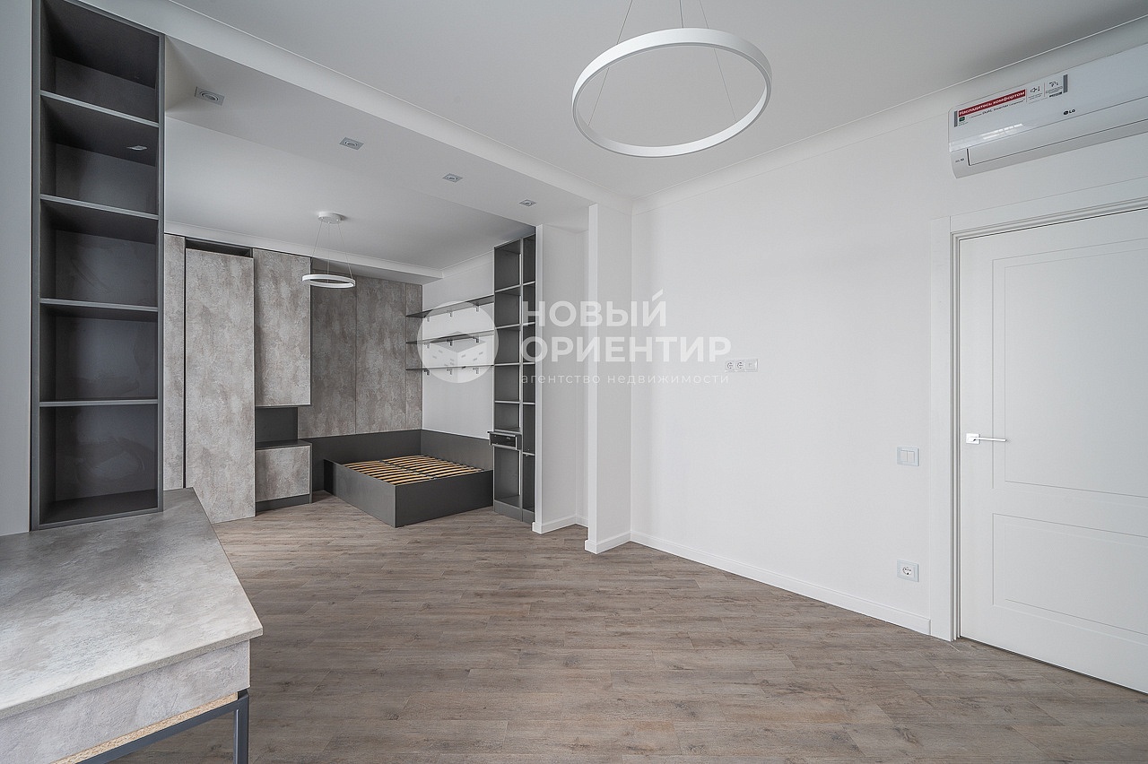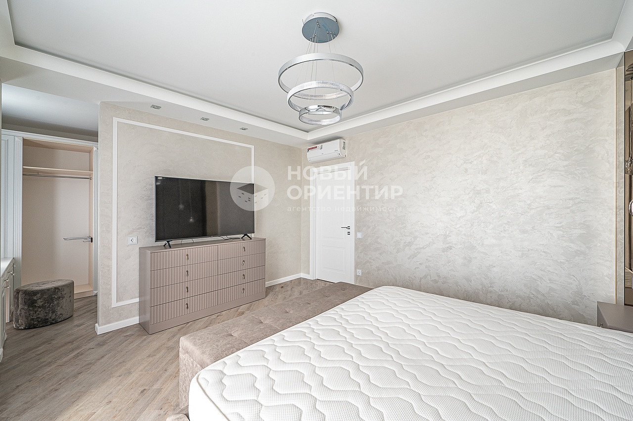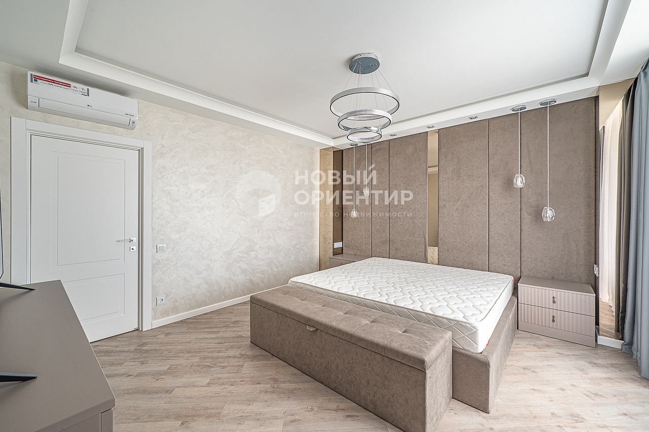 - В спальне на полу кварц винил, на стенах декоративная штукатурка, разные варианты освещения, кондиционер установлен над входом. Гардеробная площадью 9,3м2. Выход на теплую лоджию