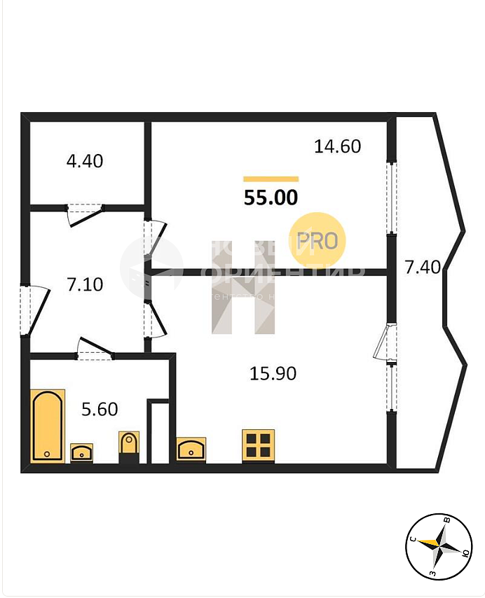 - эргономичная планировка 46.6 м² позволило грамотно выстроить пространство: спальня 14,6 м2, кухня гостиная 15,9 м2, вместительный коридор, отдельная гардеробная 4 м2, шикарная лоджия 7м2;